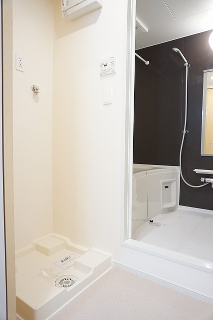 室内洗濯機置き場、浴室内乾燥機能で雨の日のお洗濯も安心しておこなっていただけます。