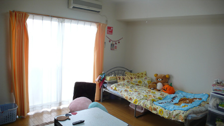 女の子らしい「カワイイ」部屋。オレンジ色のカーテンが部屋のアクセントになっています。リラックマのベットスペースは統一感が◎ですね。